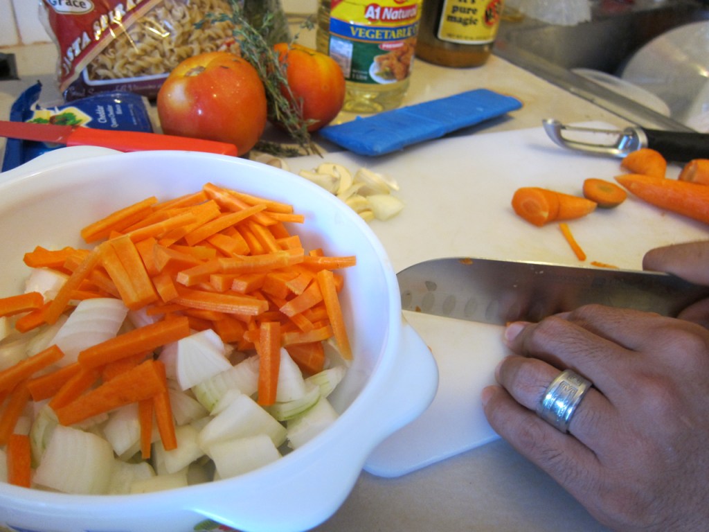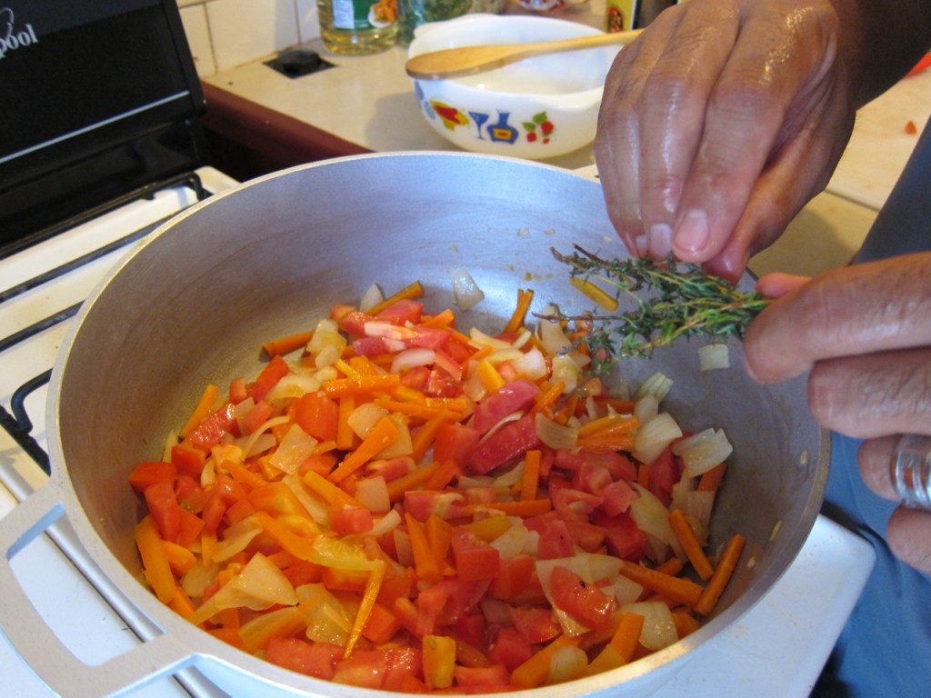 As the onions and carrots cook down, start dicing the tomatoes and prepare the thyme. You’ll know the onions and carrots are ready when the onions become translucent. Add some of the seasoning at this point.
