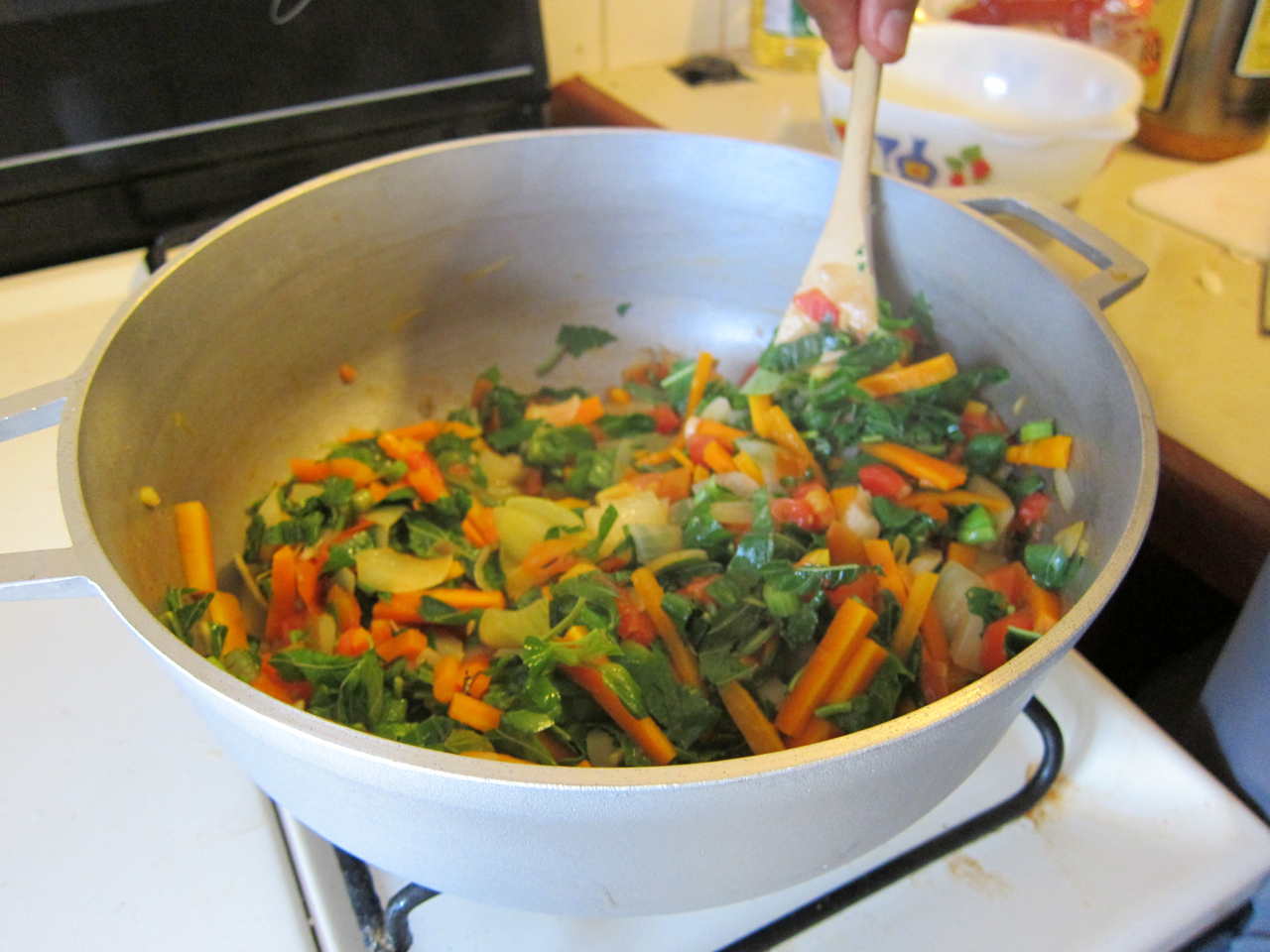Fold the callaloo into the other ingredients and cover to cook for the next 10 minutes or longer. You want the callaloo to cook down and get softer. I would suggest covering it for 5 minutes and then opening to boil off some of the water from the combined ingredients.