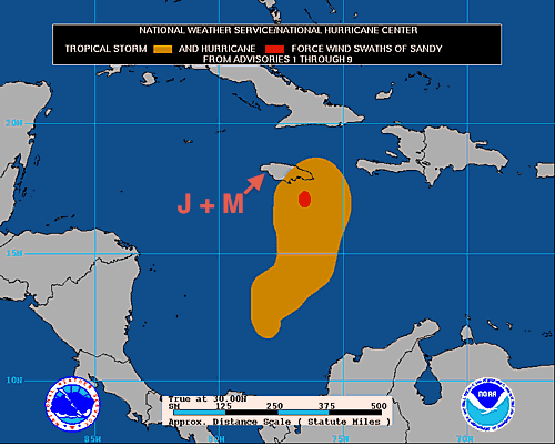 Hurricane Sandy passed us without too much excitement. As you can see in the image below, the storm did not actually cover the entire island as originally predicted but instead passed over the East side. Those of us on the West saw wind gusts for several hours, a relatively small amount of rain, and a good number of power surges and outages.