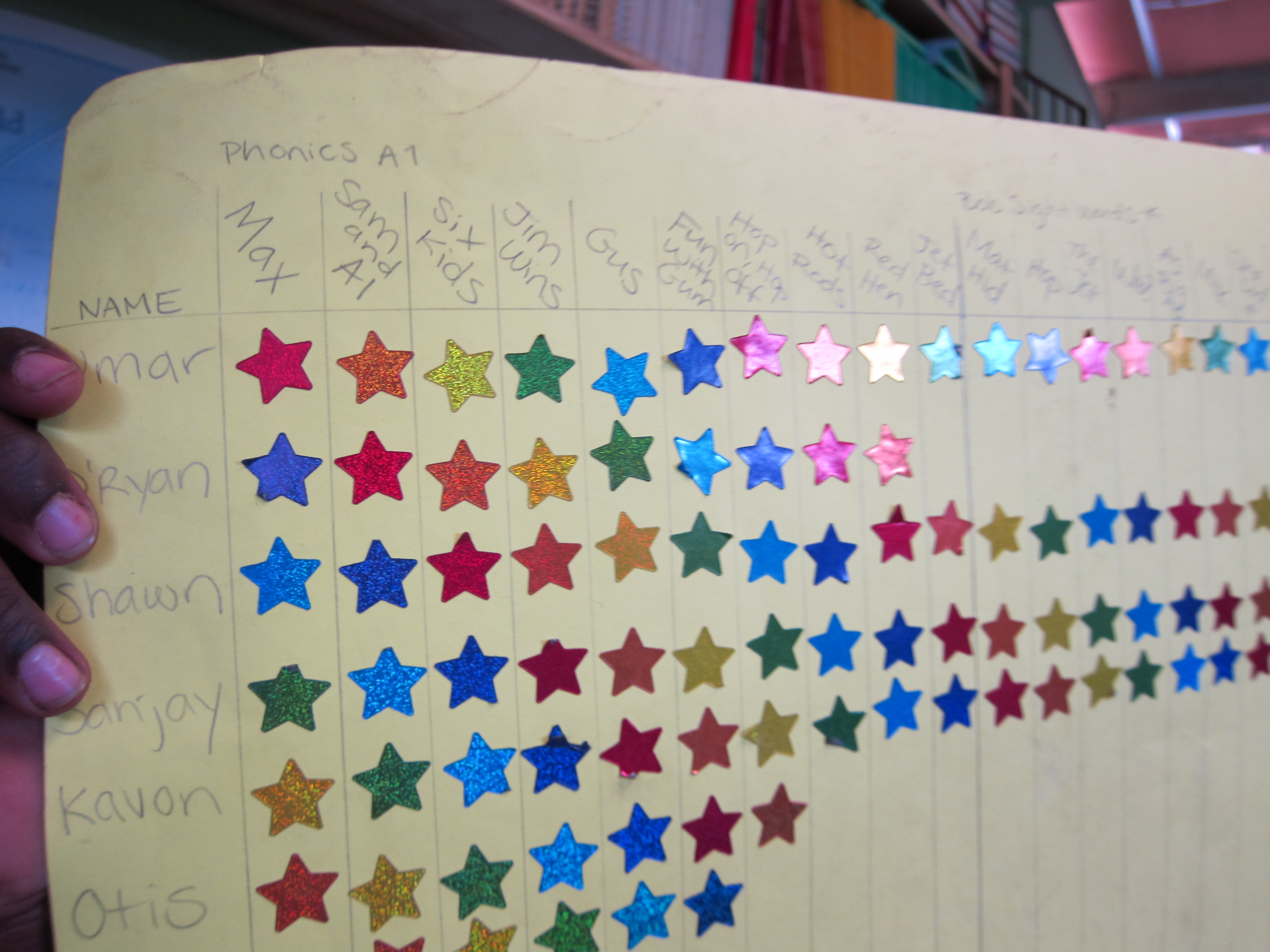 Students and teachers alike do well when they’re working toward something. If you can get your hands on “leveled readers” (a series of books that progresses through different phonics skills or builds on sight words), have the students work through the set over time. I created a chart with the students’ names on one side and the list of books ordered across the top. Each time a student read one of the books to me, they got a sticker on the chart for that book. Once they finished a set of ten, they got a bigger prize (like a whole page of stickers). Some- of course, not all- students were truly motivated by the possibility of achievement like this, whether it be to reach the prize or to read more books than their friend.