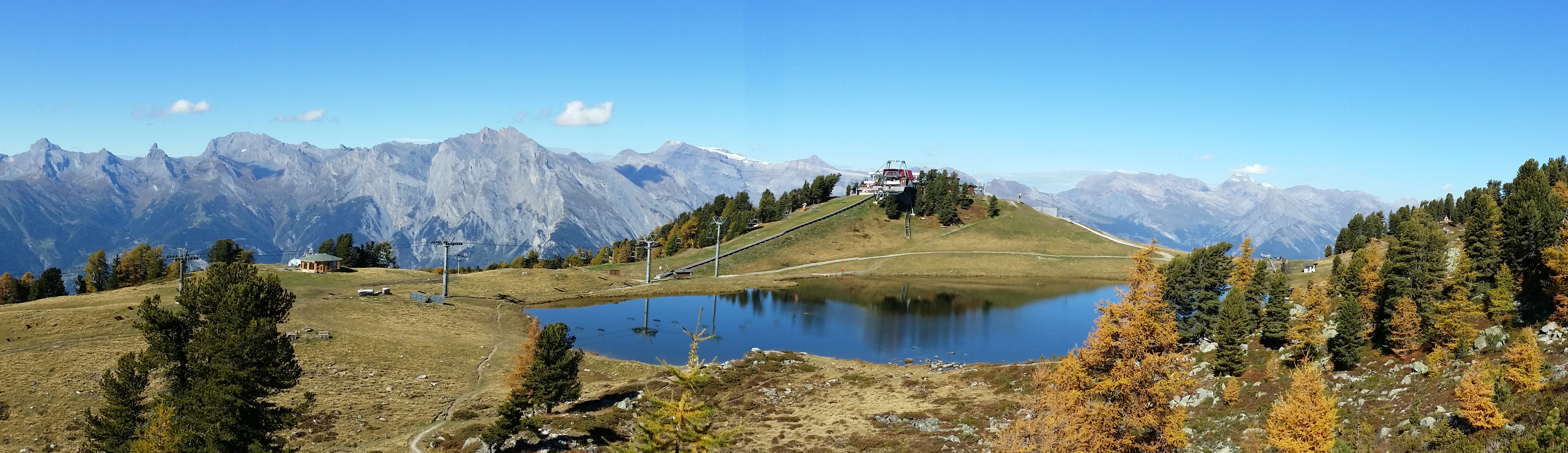 Nendaz, Switzerland. The view from the balcony or where we were staying.We were high up, but only half-way up the mountain. You can see the valley below in the background.We took a lift up to a popular hiking area. Tons of trails in the summer for bikers and hikers.A typical Swiss chalet on the side of a mountain looking at the valley below.